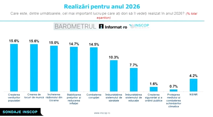 Conform unui studiu realizat de BAROMETRUL Informat.ro – INSCOP Research, în perioada 12-15 ianuarie 2026, românii așteaptă ca în anul în curs să se înregistreze creșterea veniturilor, crearea de locuri de muncă și încheierea conflictului din Ucraina. Acestea sunt prioritățile menționate de respondenți, arată datele colectate pentru acest sondaj.